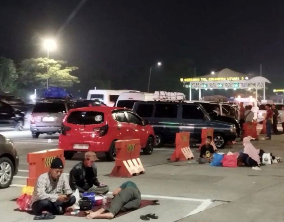Dohri bersama keluarganya tampak duduk beralaskan seadanya di dekat pembatas jalan, tepat di samping kendaraan yang diparkir. Ia mengaku memilih berhenti untuk sahur di lokasi tersebut setelah melihat banyak pemudik lain melakukan hal serupa, ditambah kondisi rest area di sepanjang Tol Jakarta-Cikampek yang sudah penuh.